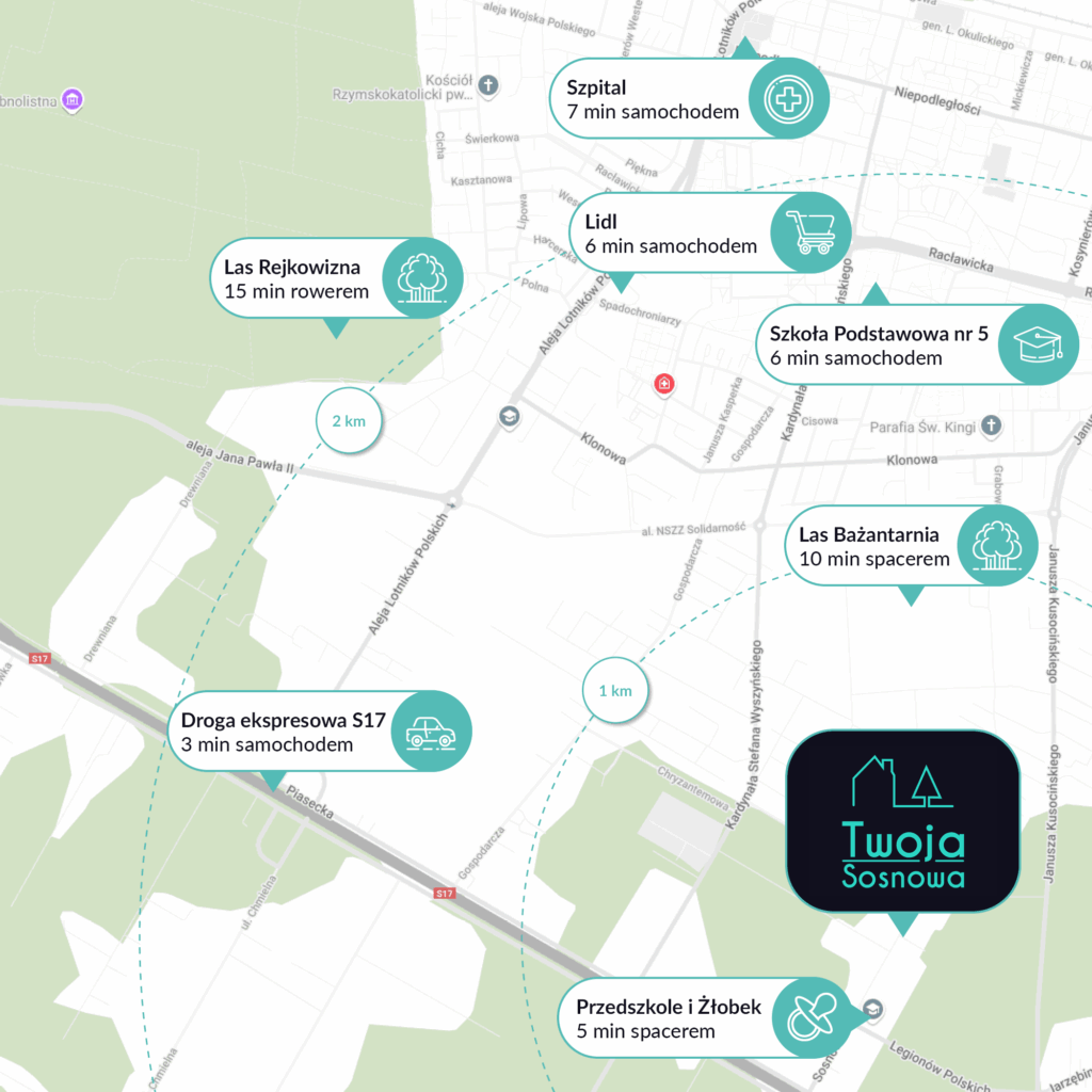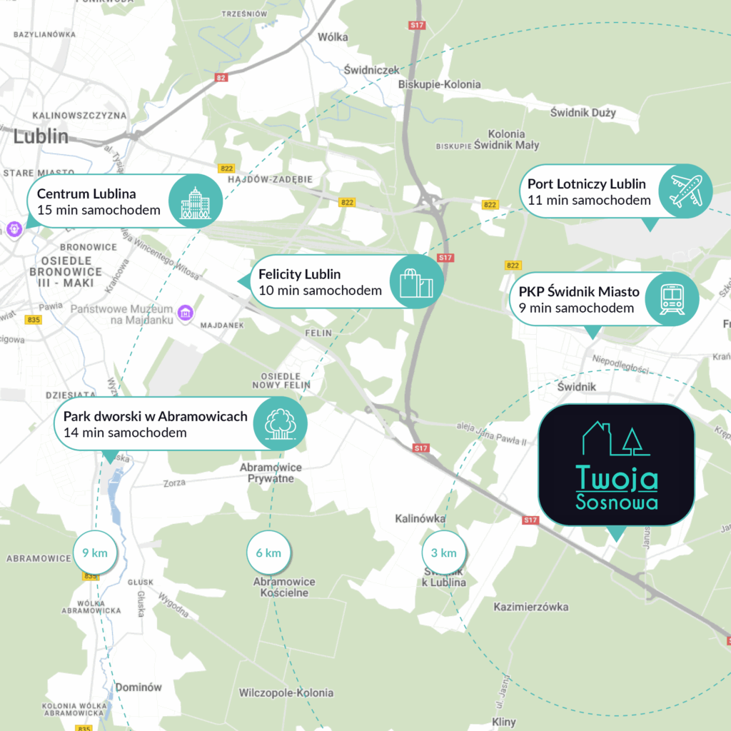 Twoja Sosnowa to doskonała lokalizacja w Świdniku dla tych, którzy marzą o spokojnym życiu w otoczeniu zieleni, ale nie chcą rezygnować z wygody miejskiej infrastruktury. Wjazd na trasę S17 znajduje się zaledwie kilometr od domu, co pozwala szybko dotrzeć do centrum Lublina – bez stania w korkach i bez kompromisów. W najbliższej okolicy znajdziesz też wszystko, czego potrzebujesz na co dzień: sklepy, szkoły, punkty usługowe czy siłownię – wszystko w zasięgu kilku minut jazdy samochodem lub komunikacją miejską (przystanki autobusowe znajdują się 10 min spacerem od domu).